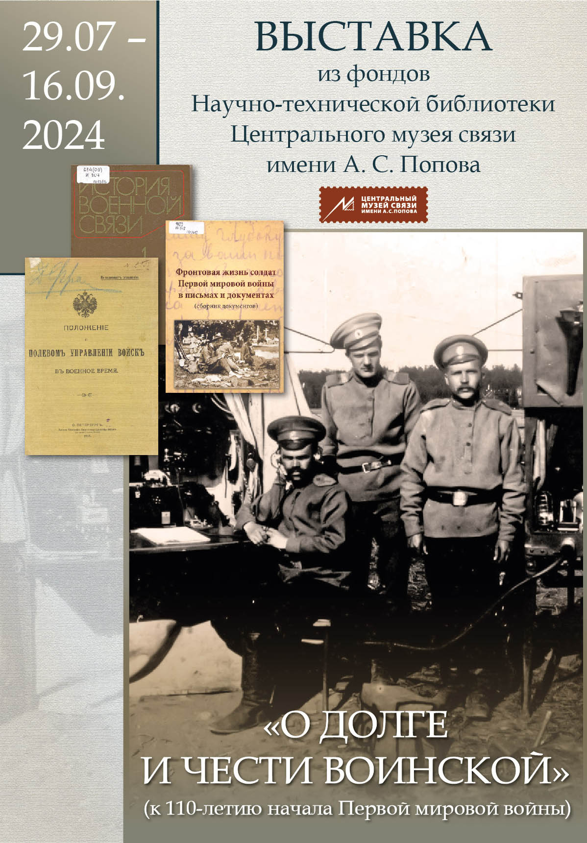 Материалы, представленные на выставке, рассказывают о службе и средствах связи в период Первой мировой войны, о работе Московского почтамта в военное время. Особый интерес представляют издания из исторического фонда библиотеки, как исторические документы, свидетельствующие о состоянии телефонно-телеграфной связи в русской армии накануне и в ходе Первой мировой войны: «Положение о полевом управлении войск в военное время»1914 г. изд., «Мнемоническая телеграфная азбука Морзе» 1916 г. изд., «Краткое описание военно-полевых телефонных аппаратов (походный справочник для военных телефонистов)» 1917 г. изд., «Руководство по полевому телефонному делу» 1916 г. изд., «Описание организации телефонной связи и телефонного имущества в полевой и горной артиллерии» 1915 г. изд., «Телефонное дело в полевых войсках» П.Невядомского 1917 г. изд., которое являлось пособием для войсковых частей, содержащее в себе описание наиболее применяемых на службе в полевых войсках телефонных аппаратов, а также «Отчет почтовой части» 1915 г. изд. Центрального Справочного Бюро о военнопленных Российского Общества Красного Креста. Из исследований последних лет заслуживает внимания справочник-каталог «Военно-полевая почта России 1914-1918 гг.», который претендует на максимально полное освещение работы военно-полевой почты России и отдельных полевых почтовых и почтово-телеграфных учреждений российской армии 1914-1918 гг. В годы Первой мировой войны зародился новый вид разведки – радиоразведка, заключавшийся в перехвате радиограмм противника, их сосредоточении в разведывательных отделах и расшифровке, обработке и анализе. Особое место на выставке по праву занимают исследования М.А. Парталы по истории радиоразведки о захвате секретных документов германского флота на крейсере «Магдебург» в августе 1914 года. |