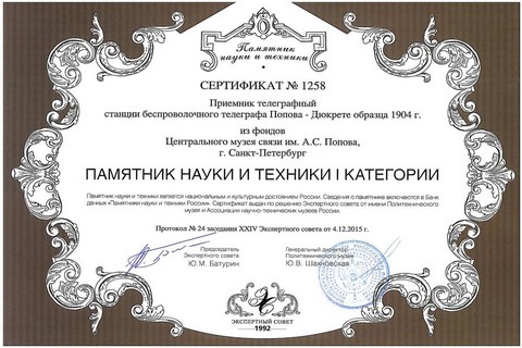 Телеграфный приемник системы Попова-Дюкрете входил в состав судовой станции беспроволочного телеграфа образца 1904 г. производства французской фирмы Э. Дюкрете. Производство приемника было мелкосерийным. |