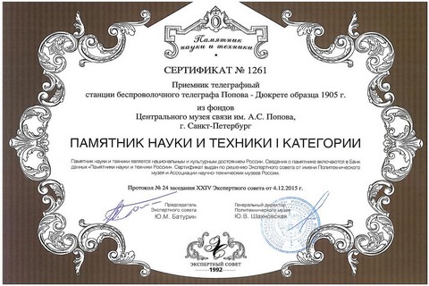 Экспонат признан памятником науки и техники I категории.