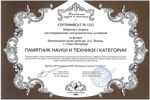 Вибратор с шарами для генерирования электромагнитных колебаний представляет большую мемориальную ценность, так как был изготовлен в начале 1897 г. по заказу А. С. Попова.