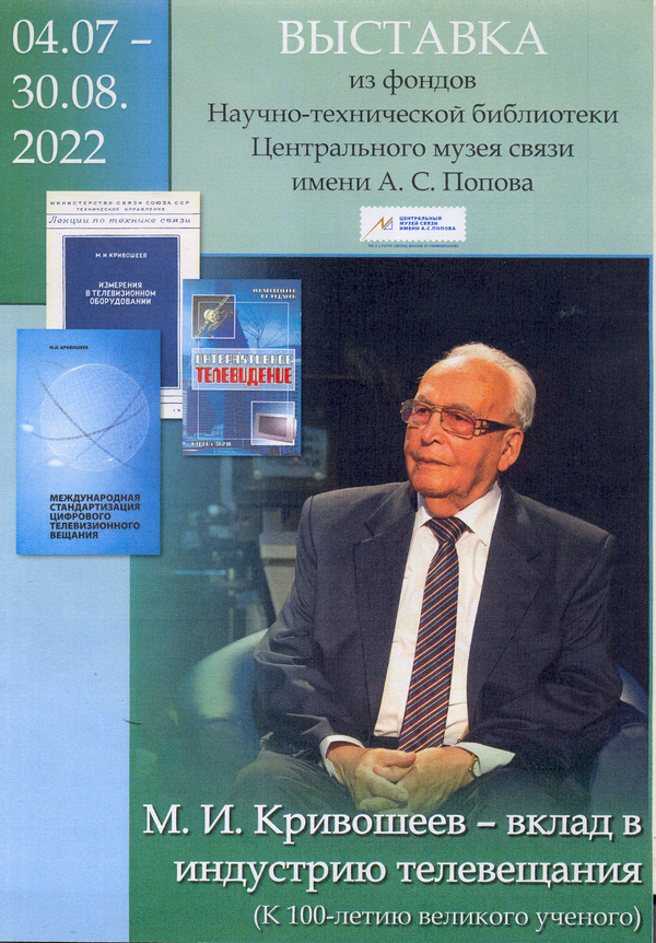 С 04.07.2022 г. по 30.08.2022 г. в Центральном музее связи имени А.С. Попова проходила выставка из фонда Научно-технической библиотеки «М.И. Кривошеев – вклад в индустрию телевещания», приуроченная к 100-летию ученого.