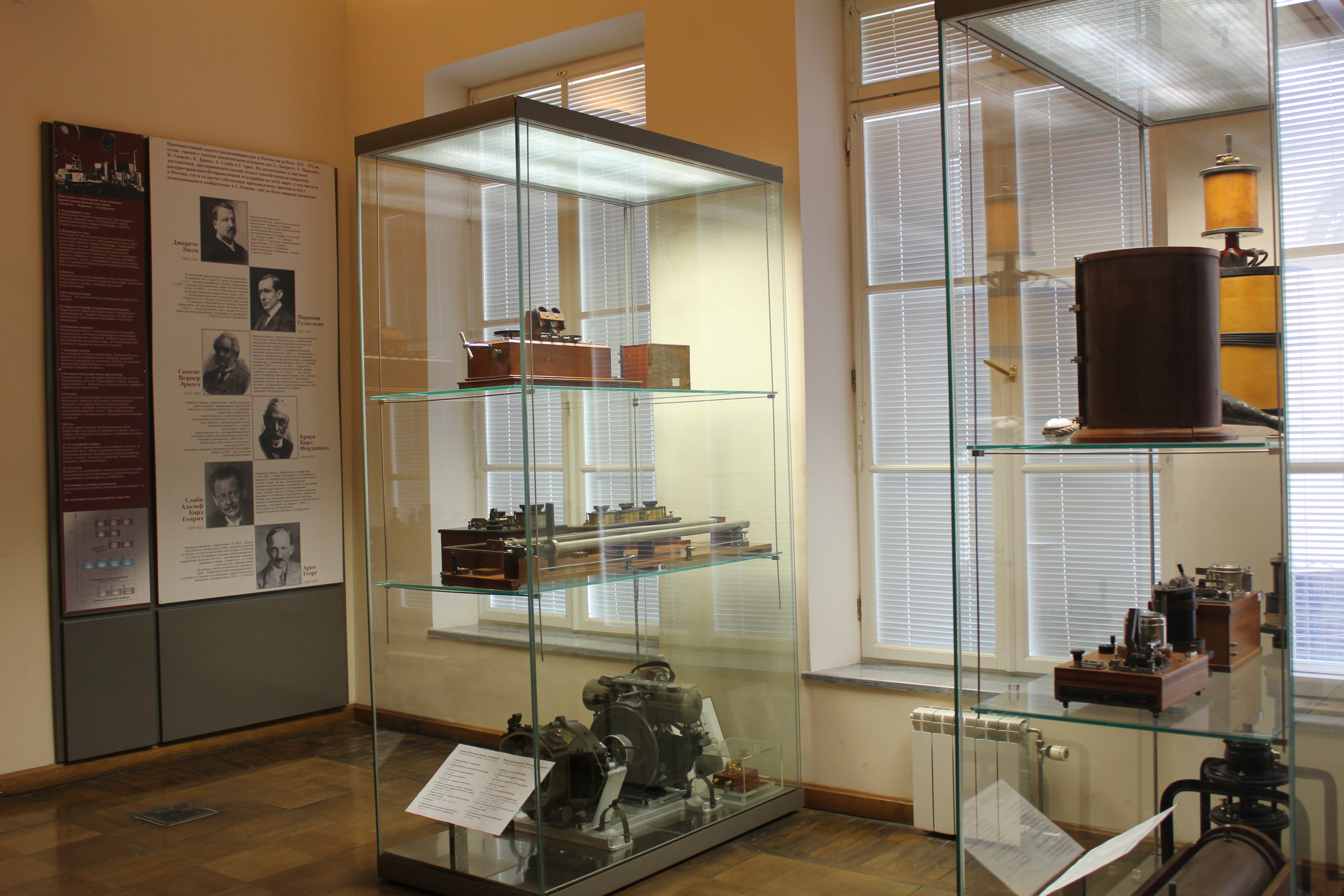 В этом зале находится действующий макет первого в мире радиоприемника А. С. Попова. |